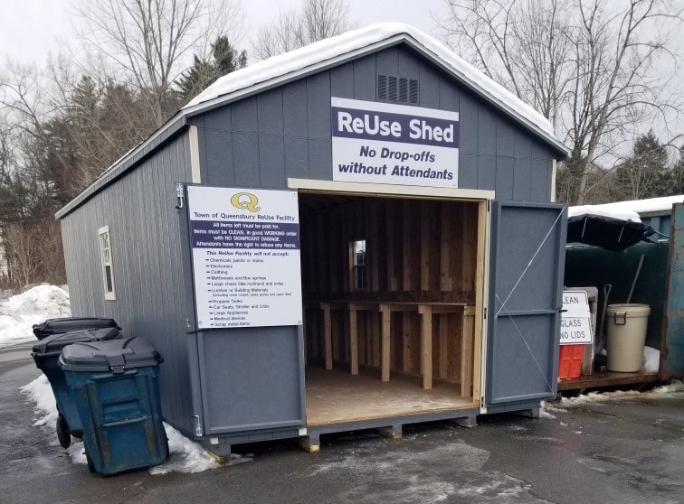 The Town of Queensbury purchased a ReUse Shed which has been installed at the Ridge Road Transfer Station at 1396 Ridge Road. The Town’s CEC and Climate Smart Community (CSC) Committees have been planning this for many years, as ReUse is a very important component of the three R’s: Reduce, ReUse and Recycle. Several different locations were evaluated, and it was determined that co-locating ReUse at the same location as recycling, collecting organic waste (composting in the future) and trash disposal would be an asset and efficient, as well as an educational element of the need to reduce ‘waste’. Reusing household items, yard tools, small appliances and other various equipment reduces the need to continue to manufacture new items and eventually discard them, saving energy on both production and the inevitable trash disposal (in a landfill or by incineration, both with a cost to the environment). Residents’ donations are welcome at the ReUse Shed on Tues/Thurs/Sat when the Transfer Station is open for business. An Attendant will check you in. You are welcome to take home used items that you may need or want. Everything is free. Please note what will NOT BE accepted as a donation: