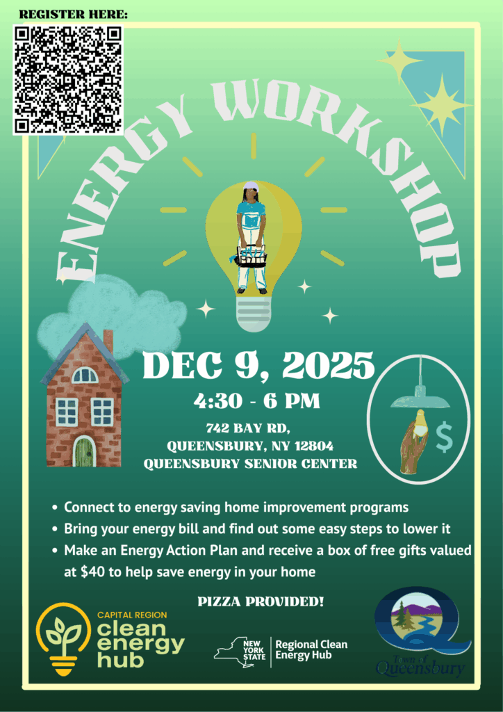 Please join the Town of Queensbury Clean Energy Community Committee and staff of the Capital Region Clean Energy Hub to learn about ways to save money and energy in your home. We will cover how to read and understand your electric bill, small changes to make in your home to increase its efficiency and programs which can help make energy saving