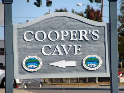 Cooper’s Cave is named after the author, James Fenimore Cooper. In 1825 after returning from exploring the Adirondacks and inspired by “these dark and silent caves” in the heart of the Hudson River, Cooper took pen in hand to write his most famous and beloved novel, The Last of the Mohicans. Located under the Cooper’s Cave bridge, which connects the Village of South Glens Falls and the City of Glens Falls, is a viewing platform adjacent to the cave with information on James Fenimore Cooper and the Mohican Tribe.